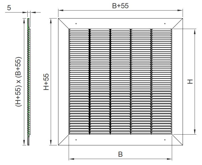Griglia stampata quadrata in acciaio da appoggio per grandi aperture 300×300 mm. Griglia stampata quadrata ad elementi con alette orizzontali fisse. Materiale: acciaio grezzo. Finiture: Verniciato Bianco RAL 9016: +20%. Altri colori: prezzi a richiesta. Fissaggio: viti a vista. .